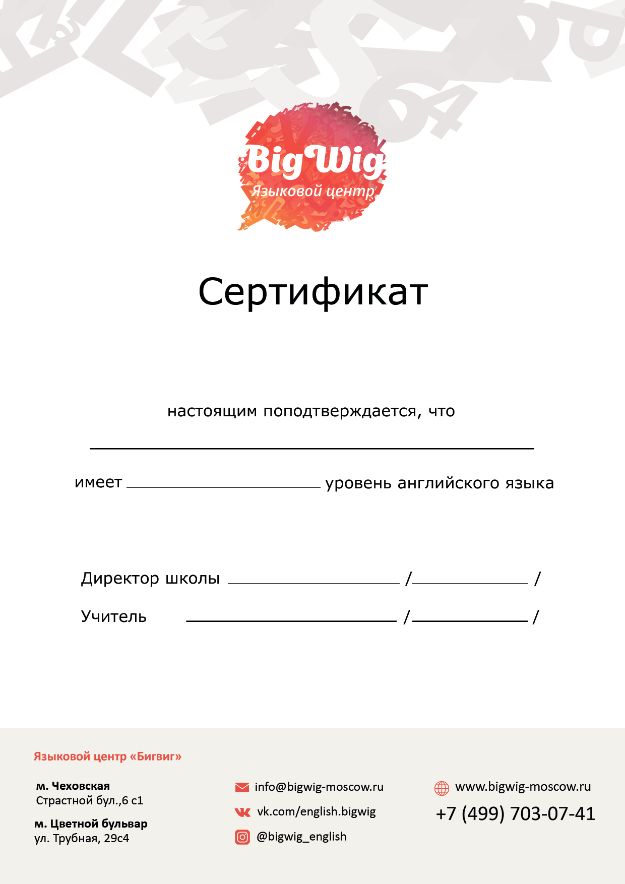 С нами вы подберете наилучший вариант обучения, пройдете бесплатный тест, который определит уровень ваших знаний, познакомитесь с нашими преподавателями, а в конце обучения получите сертификат, свидетельствующий о ваших знаниях по уровню владения языком.
